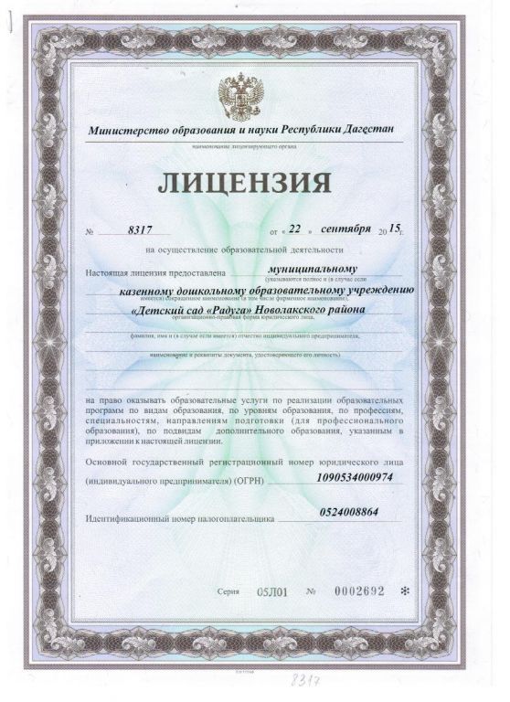 | Полное наименование образовательной организации* | Муниципальное казенное дошкольное образовательное учреждение "Детский сад "Радуга" |